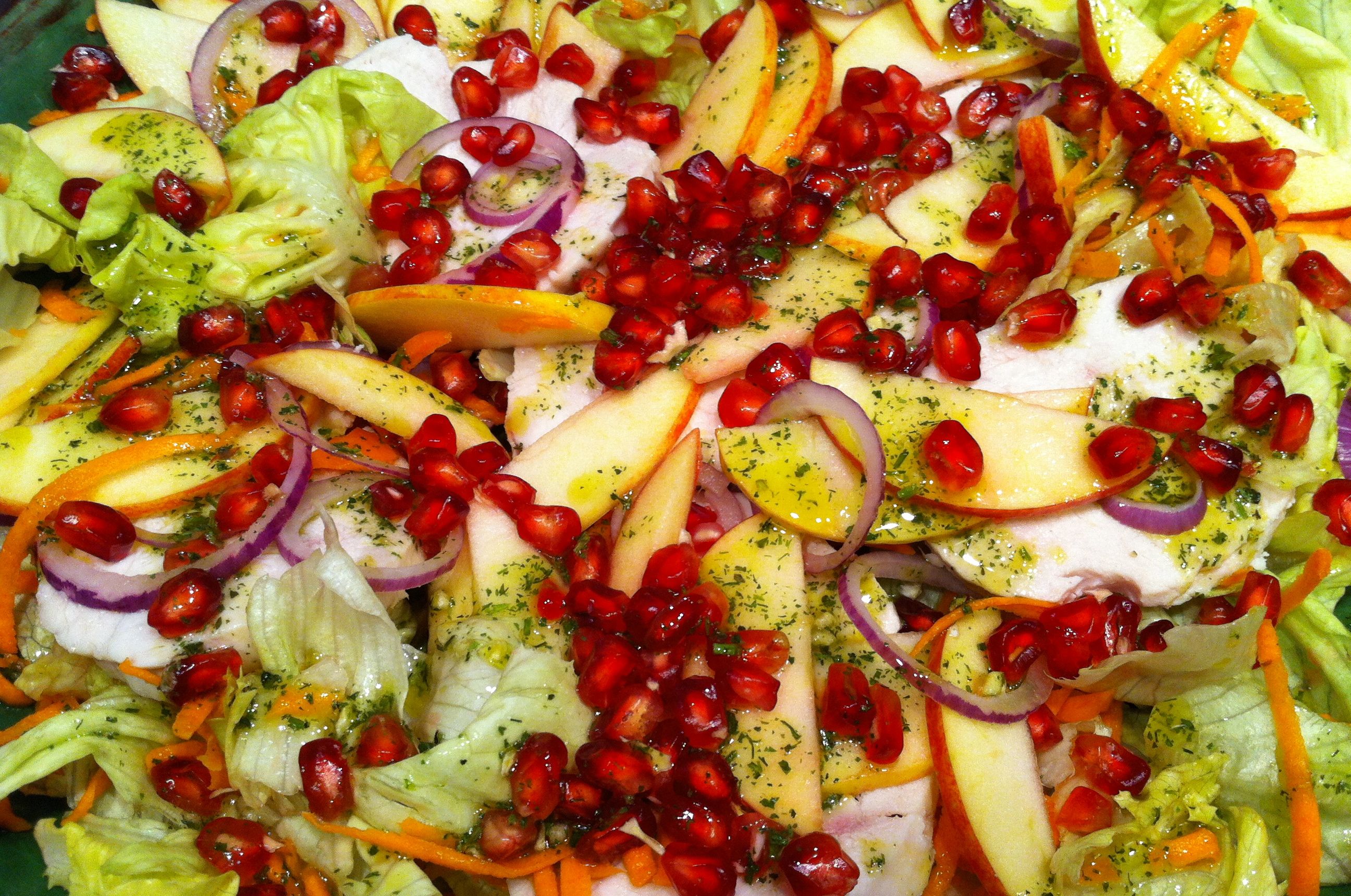 Lettuce, iceberg, carrots, slow cooked chicken, apple, red onion, some lemon juice and a french herb vinaigrette dressing. With half a pomegranate scattered on top it looks (and tastes) like a feast.