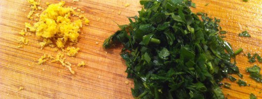 Pulse until they are just broken up. Add 3 cloves garlic and 1 small chopped onion. Also add a handful of fresh chopped parsley and the juice and zest of 2 small lemons.