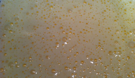 In the meantime, crack four eggs into a big bowl and add 3dl of caster sugar. Whisk vigorously until it’s all pale and light with lots of little air-bubbles trapped in the mix.