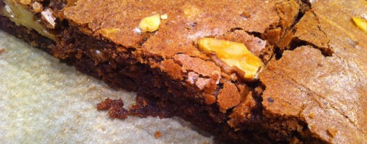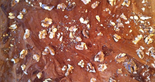 Add half of your toasted nuts to the flour. Then gently fold in the flour mix into the egg mix, immediately followed by the chocolate and butter mix. Stir as little as possible while making sure it’s all fairly even. Pour into your baking tray, gently smoothing it out until sort of even. Sprinkle the rest of the nuts on top.
